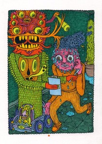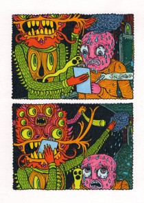 Our hero is insanely nervous. He’s about to undergo an intense psychic initiation known as the Inner-Space Birth Ritual. You’d be nervous, too! Theo Ellsworth has faithfully documented our hero’s bizarre experience in the pages of Birthday.