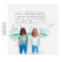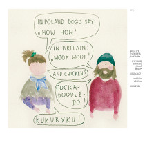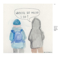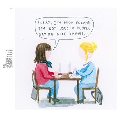 The minimalist watercolors are enriched with text (both in Polish and English), used to highlight or outline the nuances of common experiences and unexpected situations faced by a Pole outside Poland. They are frequently comical – either through laying bare prevailing stereotypes (on both sides) or through making wry observations of cultural differences.