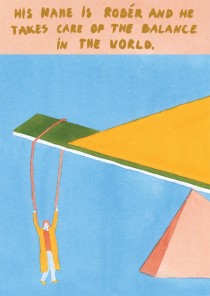 Robér takes care of the world’s balance. On his day off he’s powerless – accidents start to develop and Robér worries that everything will collapse. Domino is written by Anete Daubure and drawn by her sister Rūta Daubure.