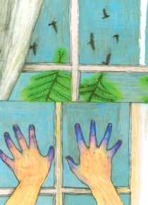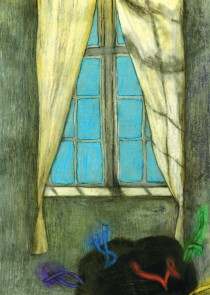 The slow moments before falling into sleep. The sound of sparrow’s wing feathers, a rumpled tablecloth and curtains moving with the wind. The night draws closer and gently darkens the sky.