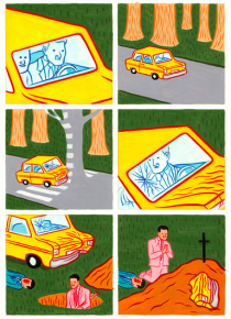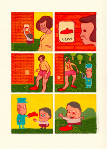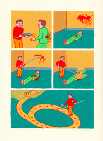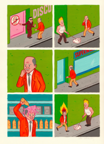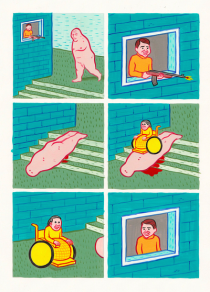 Like Pierre La Police, Joan Cornellà tries to offend by contradiction. However, his pursuit for aesthetic and cynicism gives a different tone and colour to his stories. This child-like drawings hide real violence both free and very surrealistic, just as the very first creations of Buñuel and Dalí. Therefore, it’s not that surprising that the author readily admits and appreciates Kamagurka and Herr Seele, the creators of Cowboy Henk.