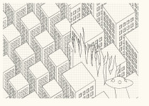 A gridiron plan city, early morning. America, North. Wake-up alarm, commute. People’s daily lives, the street, the gray square pattern background of offices opening for business. Suddenly, tearing past the crowd, a man makes off. Police. Pursuit. This man though is possibly the most insignificant character in town: a sandwich man. That’s just it. The sign he’s carrying, and that he won’t let go of, makes him precisely most remarkable.