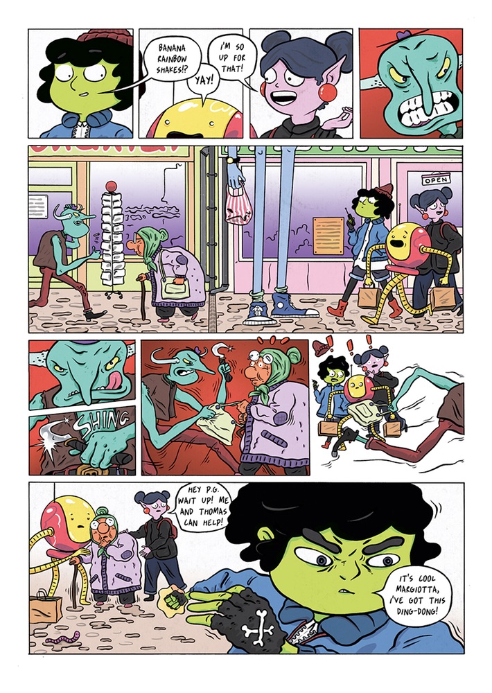 She’s just had a tooth taken out by her super weird dentist, her best friend Margiotta Moonshine might be stuck in her mundane decorating job forever, her Robot Thomas is feeling obsolete, and there’s a mysterious puppy watching her every move.