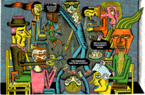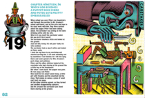 The beloved puppet of children’s literature, a figure that has been a continuous inspiration for artists all over the world, here presents an entirely new gallery of heroes and adventures. The graphic design plays with scale. The pages are peopled with historiated initials reminiscent of illuminated manuscripts, giant page numbers, avant-garde references and a medley of geometrical characters, their neon colours boldly outlined in black. Spread after spread, the mix of different layouts and the uncommon use of line-cut technique make for a truly extraordinary picturebook.
