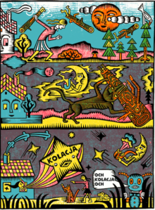 Ukochana kukiełka literatury dziecięcej, postać będąca nieustającą inspiracją dla artystów na całym świecie, prezentuje tu zupełnie nową galerię bohaterów i przygód. Projekt graficzny bawi się skalą. Na stronach pojawiają się historyzujące inicjały przypominające iluminowane manuskrypty, olbrzymie numery stron, awangardowe odniesienia i gama geometrycznych znaków, których neonowe kolory śmiało zarysowują się w czerni. Rozkładówka po rozkładówce, mieszanka różnych układów i niecodzienne zastosowanie techniki linorytu składają się na naprawdę niezwykłą książkę graficzną.